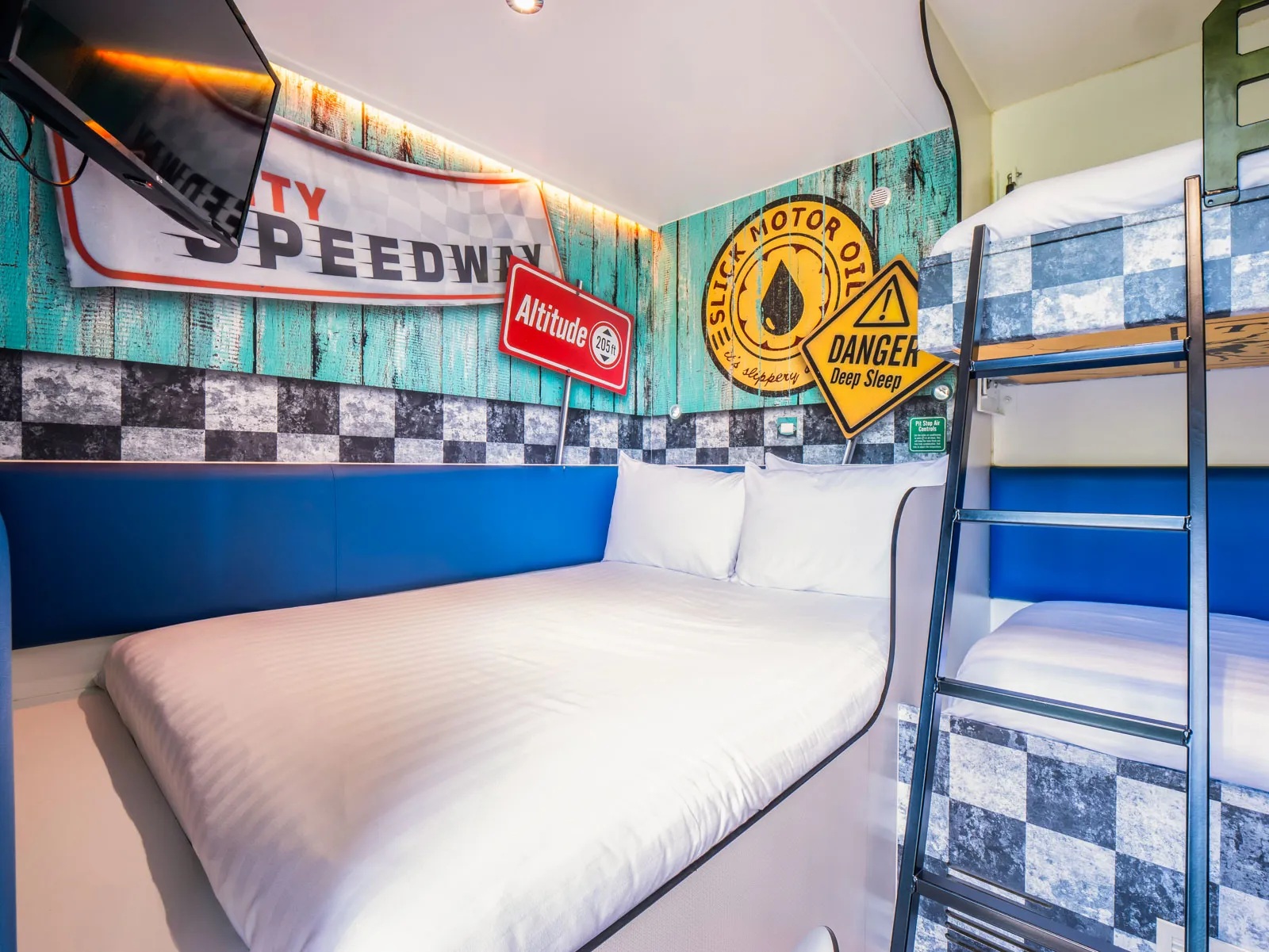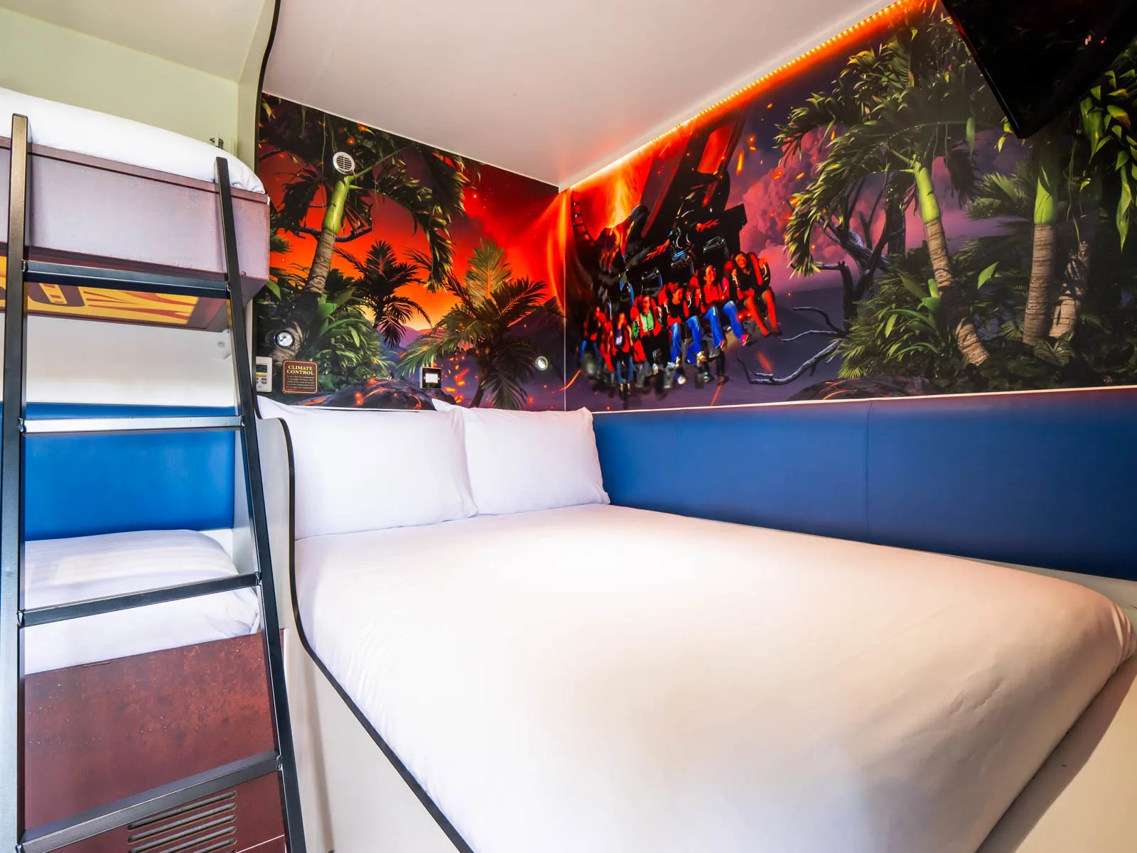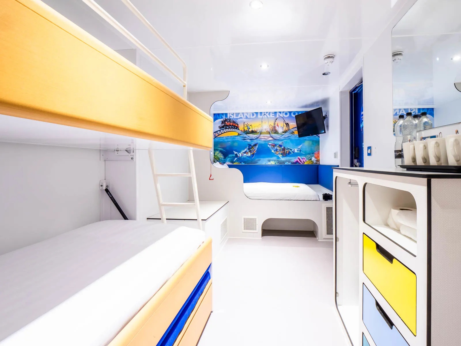 The Thorpe Shark Cabins is located adjacent to the Dome near the entrance to the park, with access via a walkway to the main bridge. Each room has an en-suite wet room with shower, basin and toilet, double bed and bunk beds, air conditioning, flat-screen TV and free WiFi.
